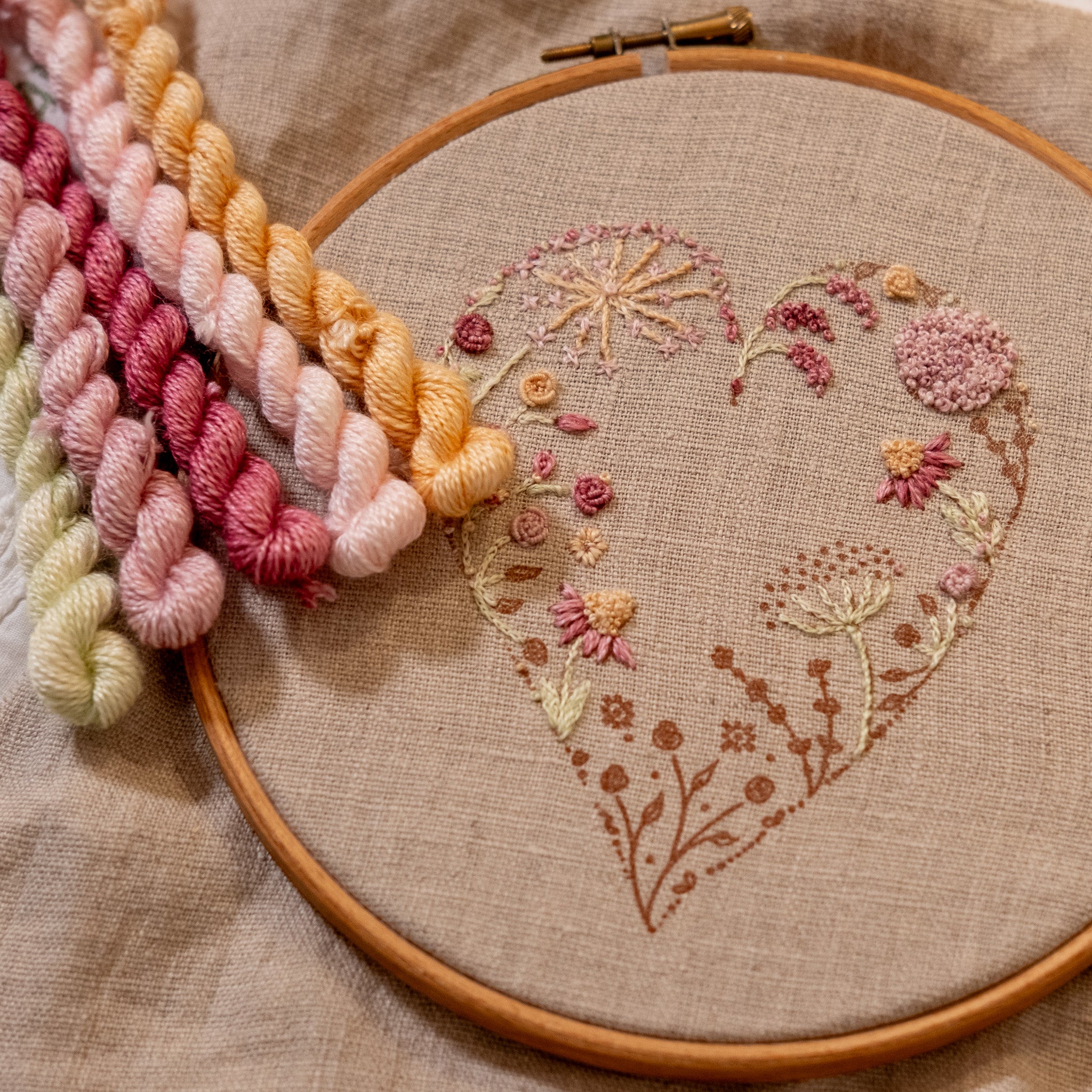 Original design by Chris in his botanical style, hand printed onto pure linen and 5 x 3g hand dyed embroidery threads on our BFL/silk base.