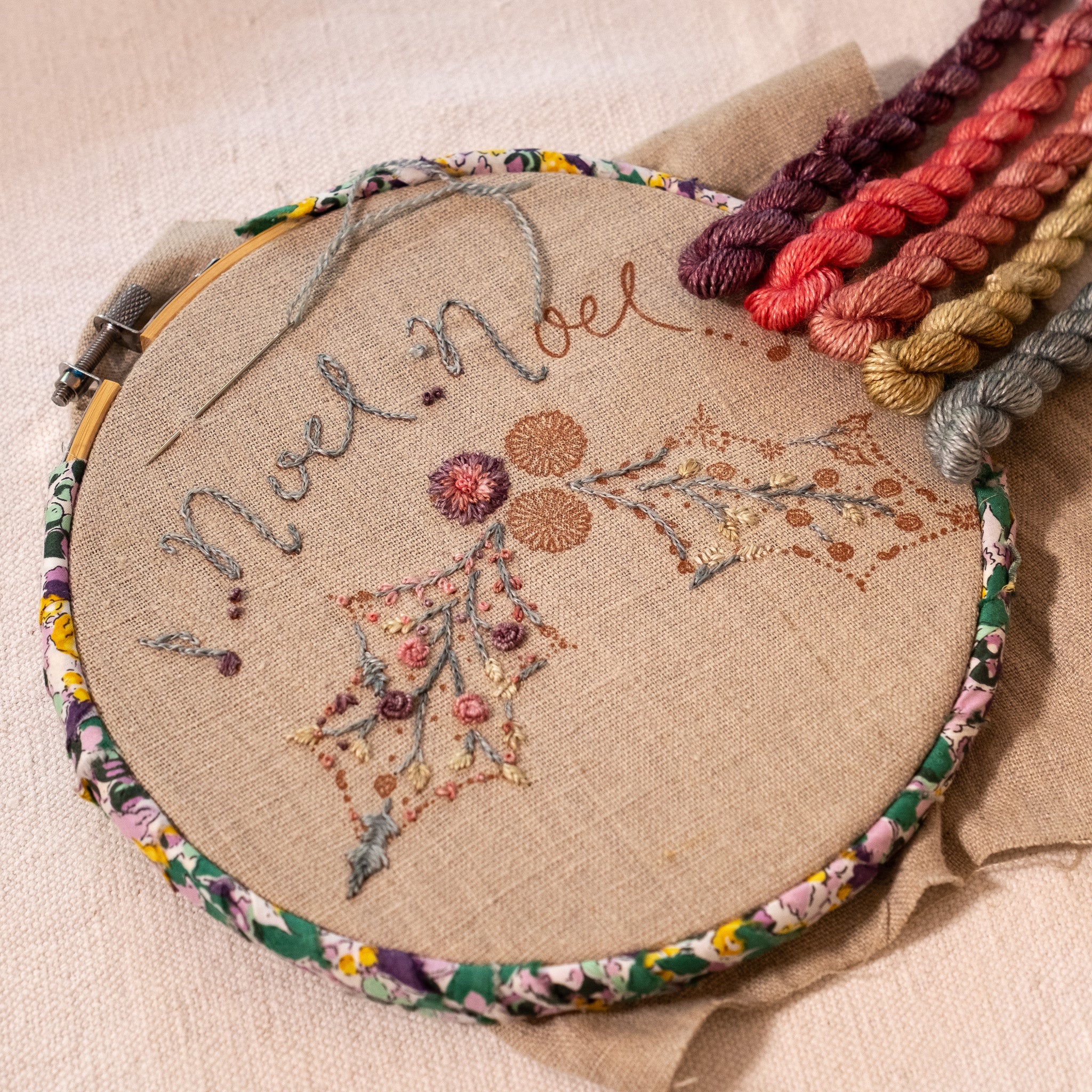The pattern is printed onto a pure linen fabric and comes with 5 hand dyed threads on our BFL/Silk base.