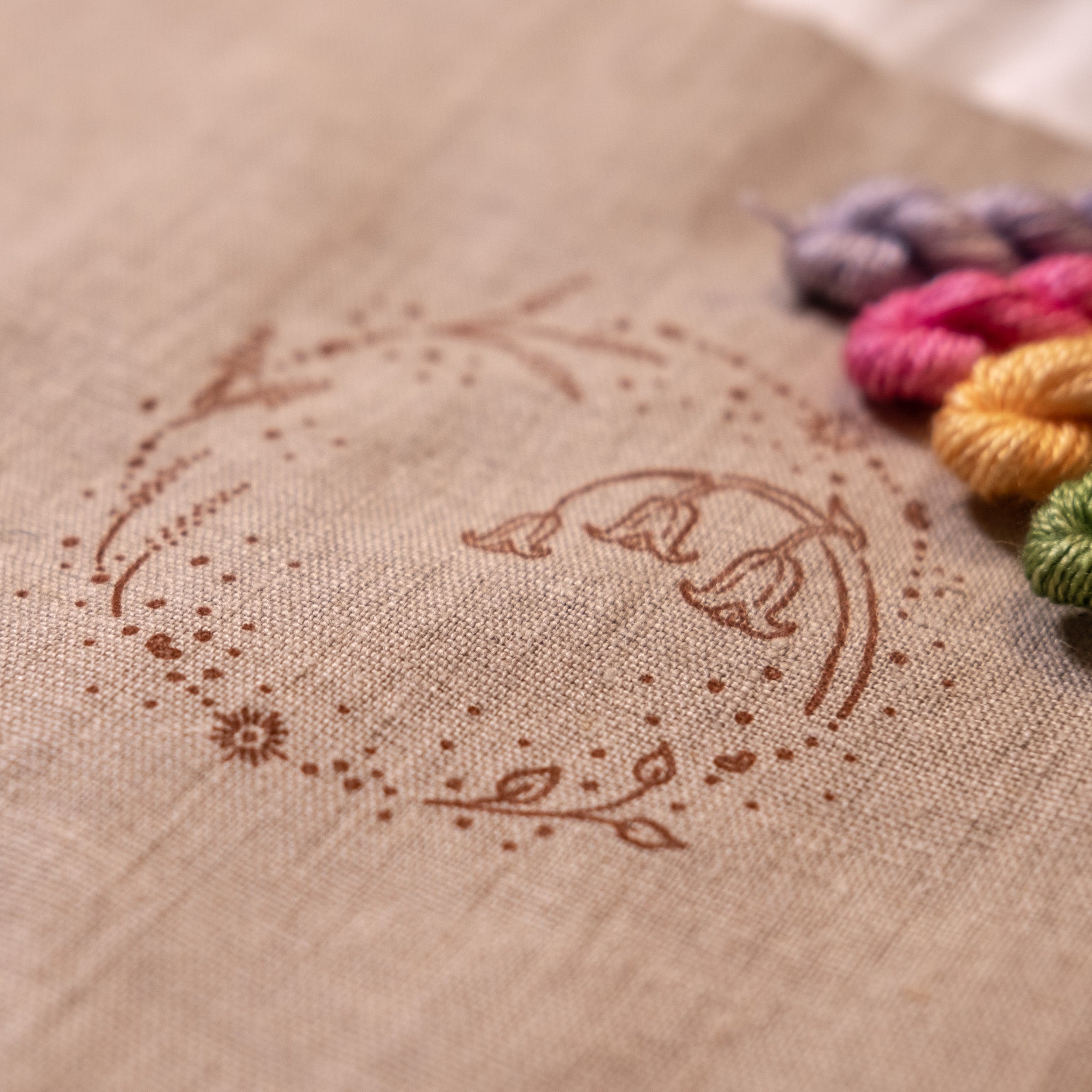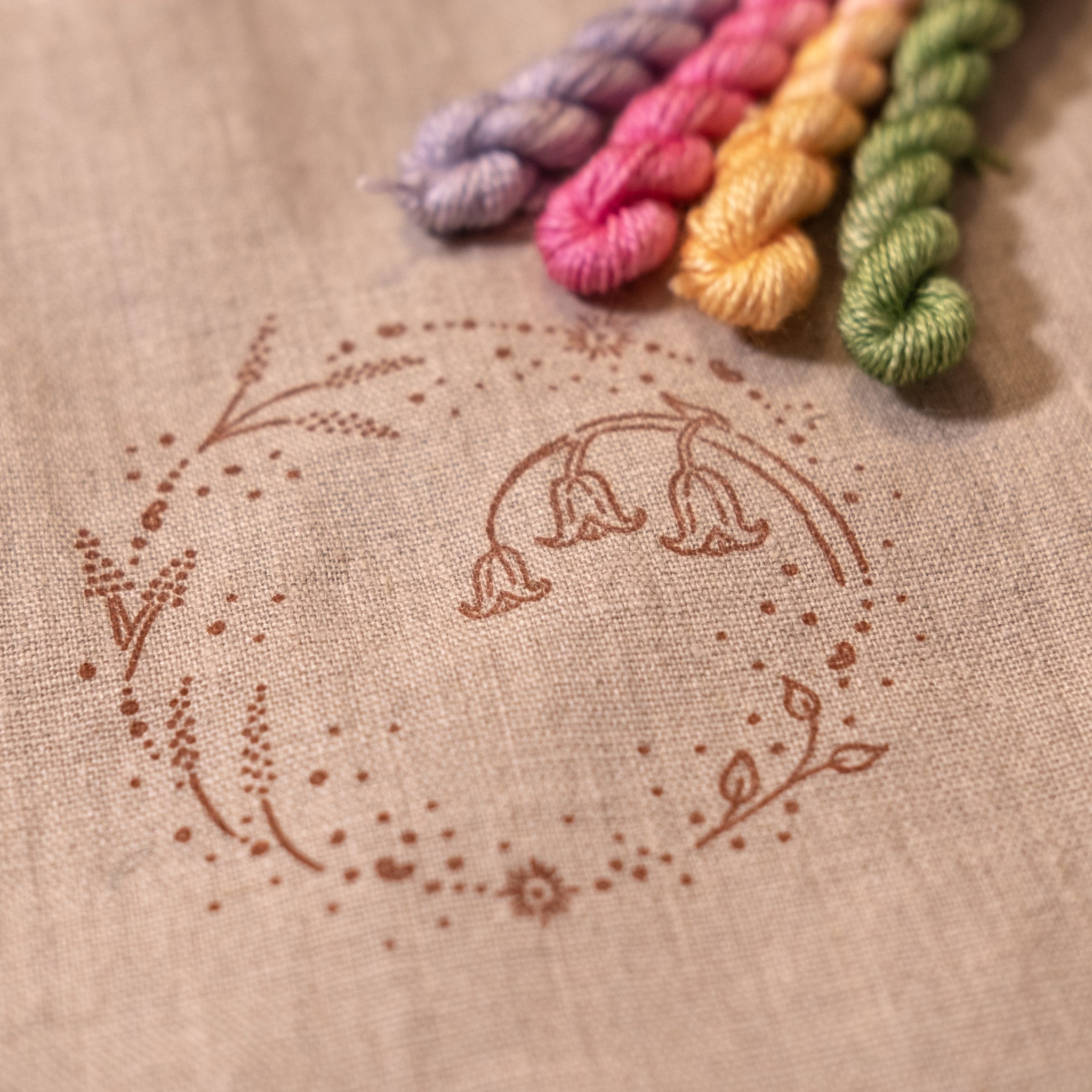 The pattern is printed onto a pure linen fabric and comes with 4 x 3g hand dyed threads on our BFL/silk base.
