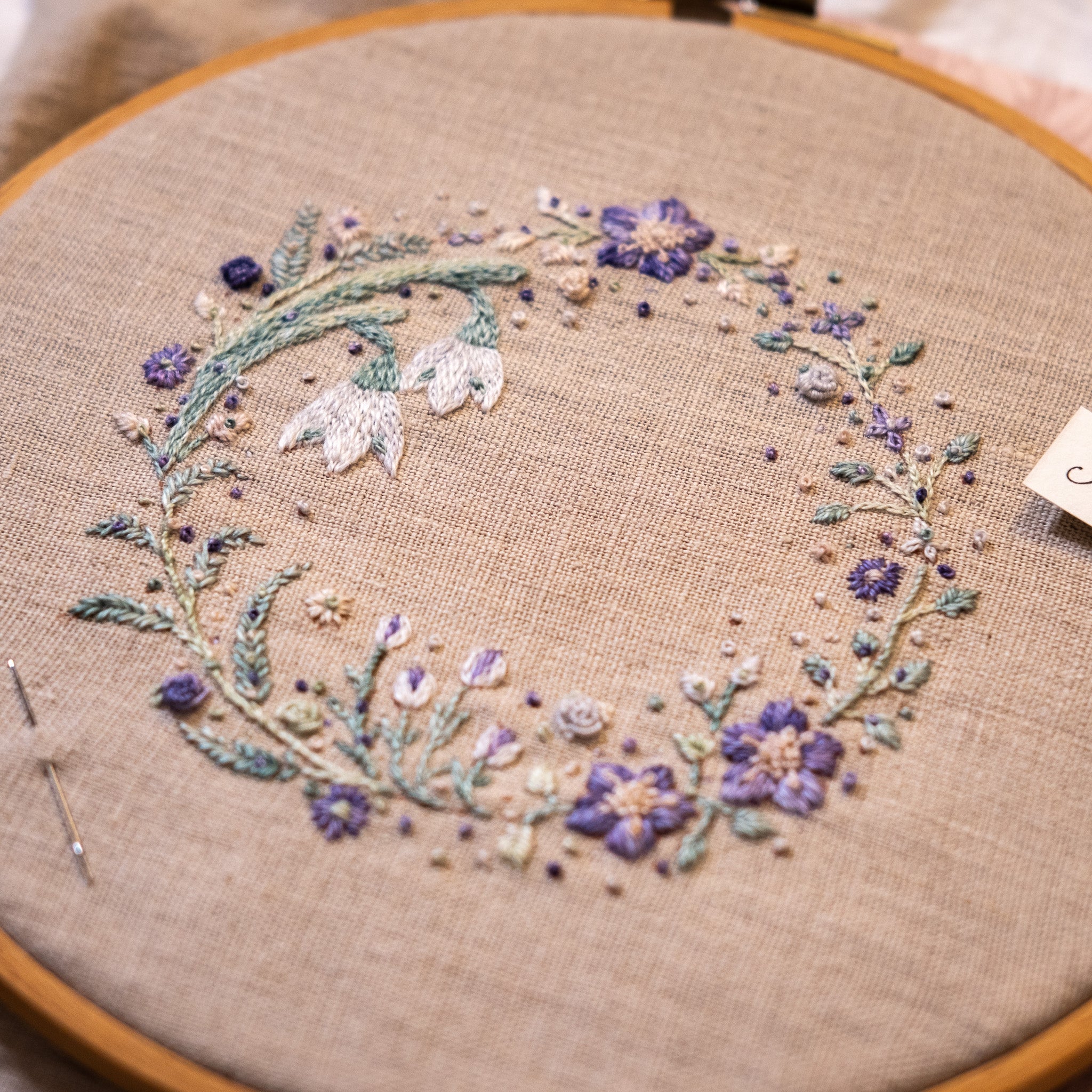 Each month we will look at the seasonal flowers and create a little floral wreath, designed by Christopher, for you to stitch.